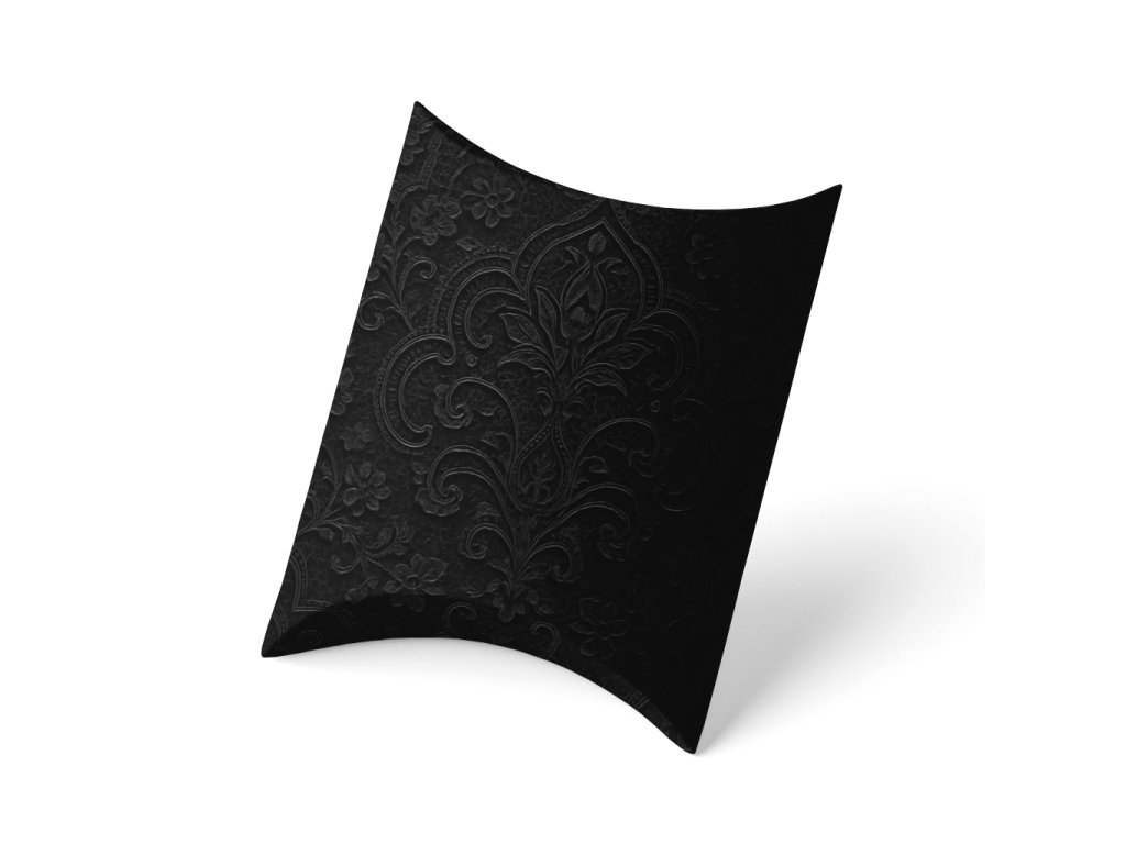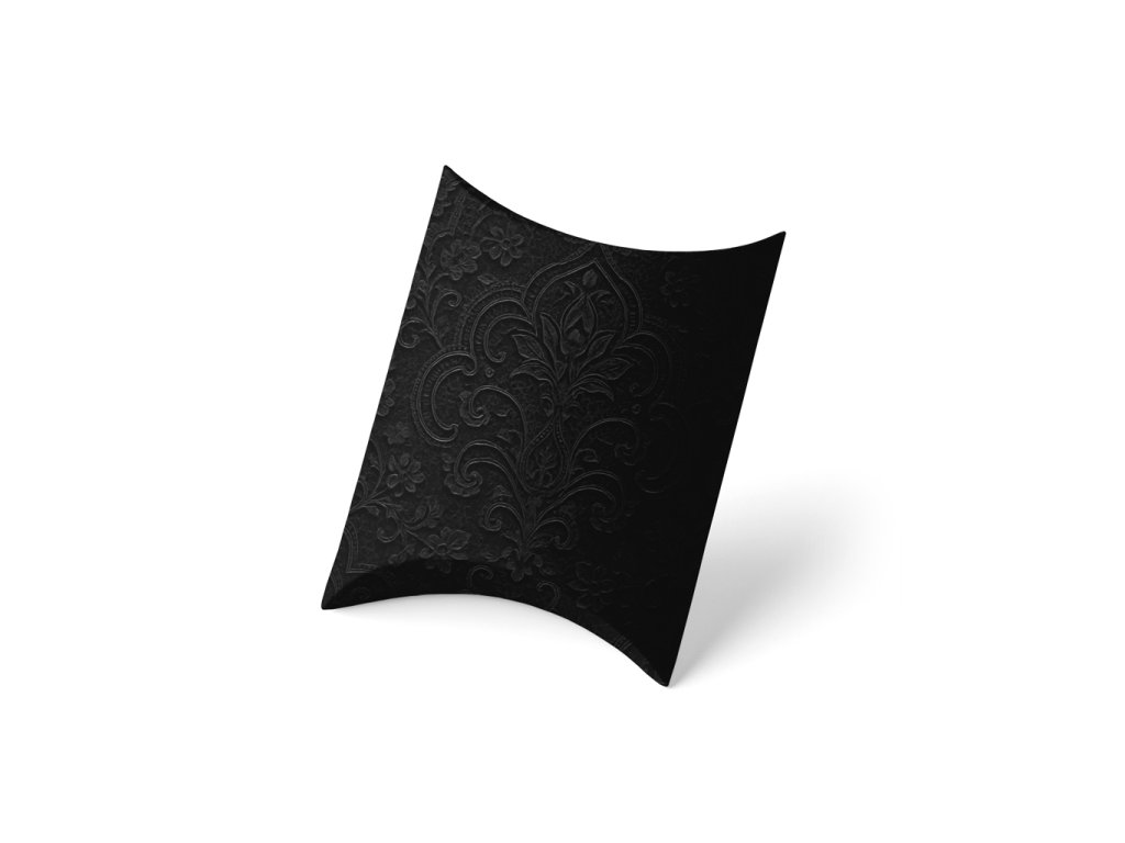 Naše černá „pillow box“ krabička s nádherným emboss dekorem je dokonalým řešením pro balení drobných dárků, bižuterie, svatebních suvenýrů nebo luxusních doplňků. Černá barva a decentní reliéfní vzor dodávají balení výjimečný nádech elegance a sofistikovanosti.