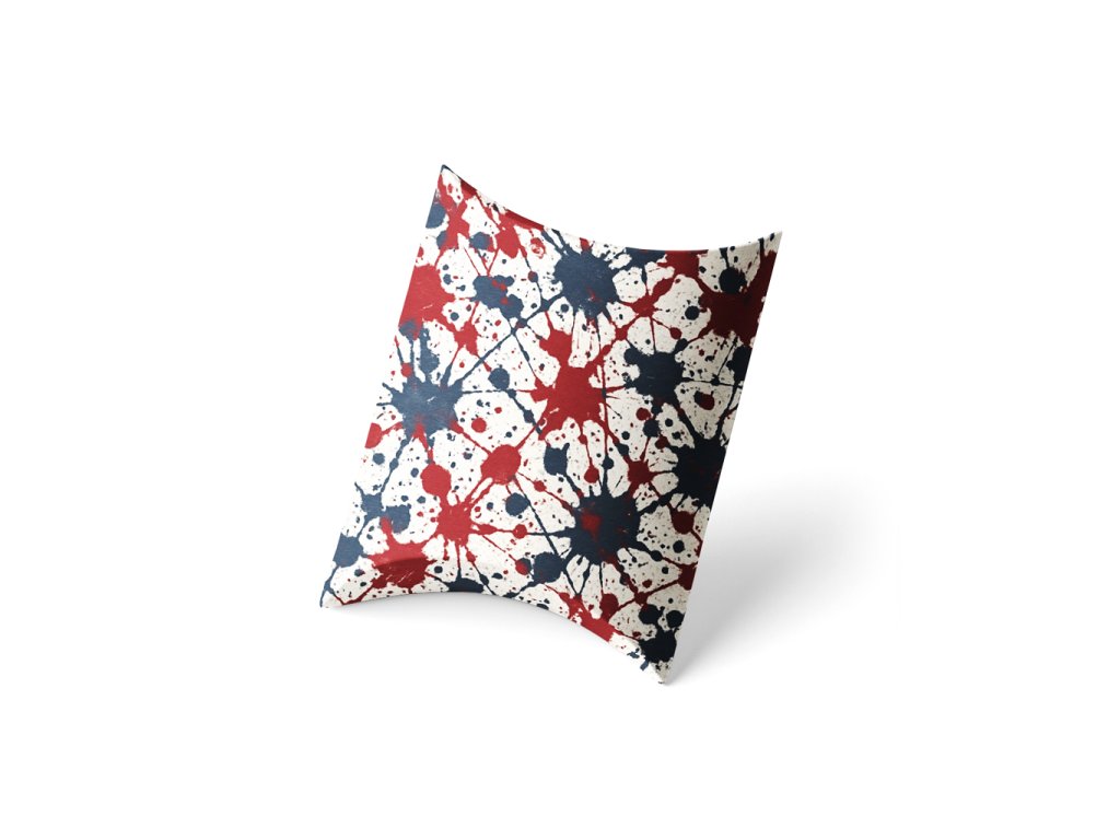 Tento pillow box je opravdovým kouskem umění – jeho design připomíná abstraktní malířský obraz plný energie a svobody. Červené a modré cákance na světlém podkladu dodávají balení jedinečný „arty“ charakter. Skvělý výběr pro dárky, které mají překvapit a potěšit – od ručně vyráběných šperků přes módní doplňky až po sladké překvapení.