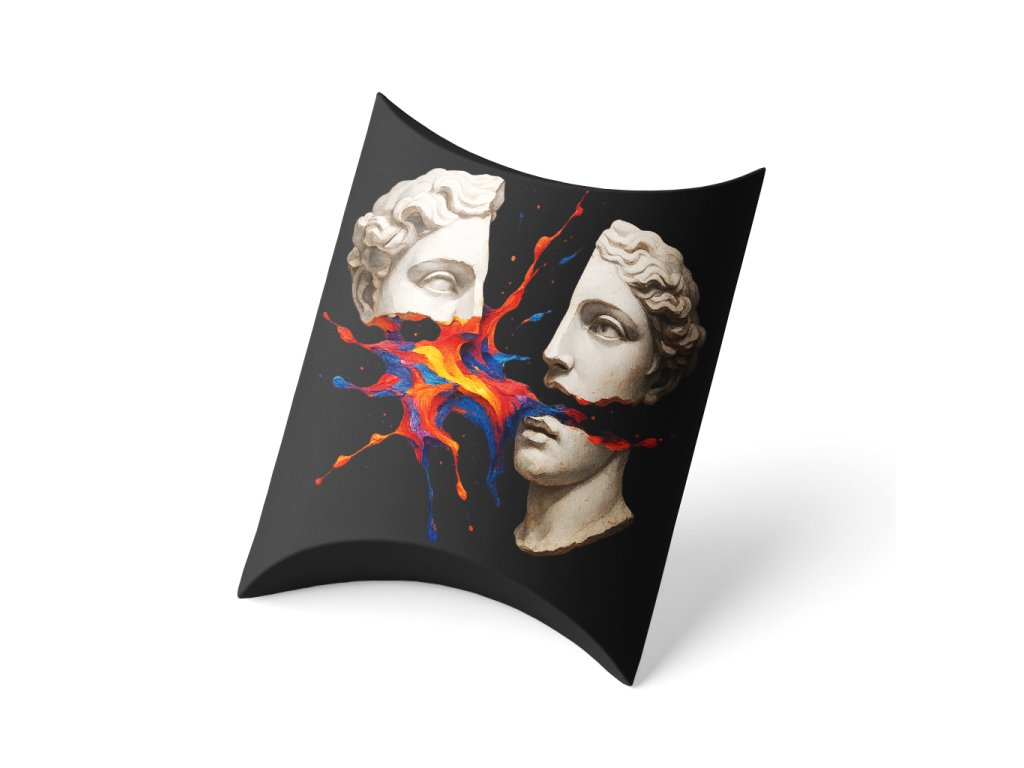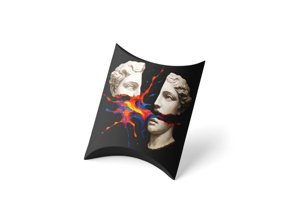 Tento pillow box je skutečné designové dílo, které promění každé balení v malý manifest kreativity. Černý podklad zvýrazňuje dramatický motiv dvou antických bust propojených explozí živých barev, které připomínají malířský šplích akrylu. Skvělý pro dárky, které si zaslouží umělecký a trochu rebelsky originální obal – šperky, dárkové poukazy, designové doplňky nebo třeba ručně vyráběnou kosmetiku.
