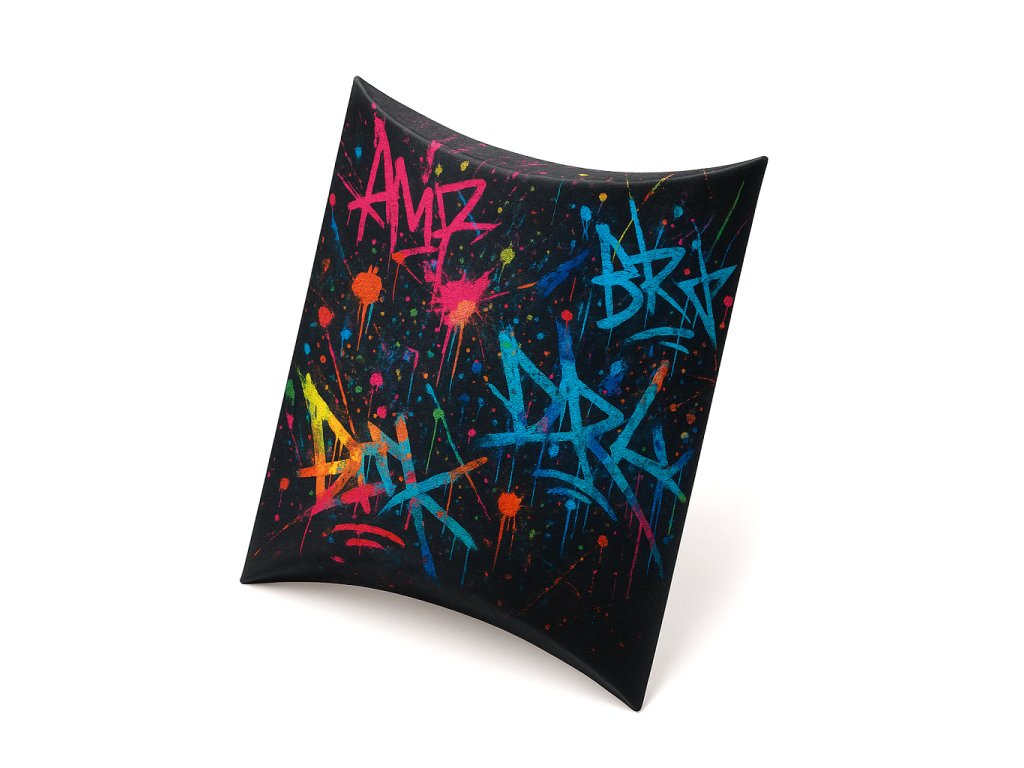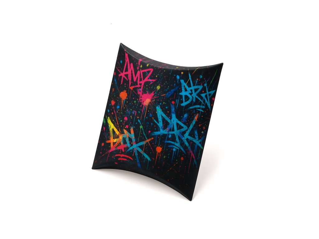 Tato černá pillow boxka je pokrytá pestrobarevným graffiti potiskem, který okamžitě přenese vaše dárky do světa street artu a městské energie. Ideální pro balení dárků pro mladé, kreativní duše a všechny, kdo milují svobodu a barvy velkoměsta.