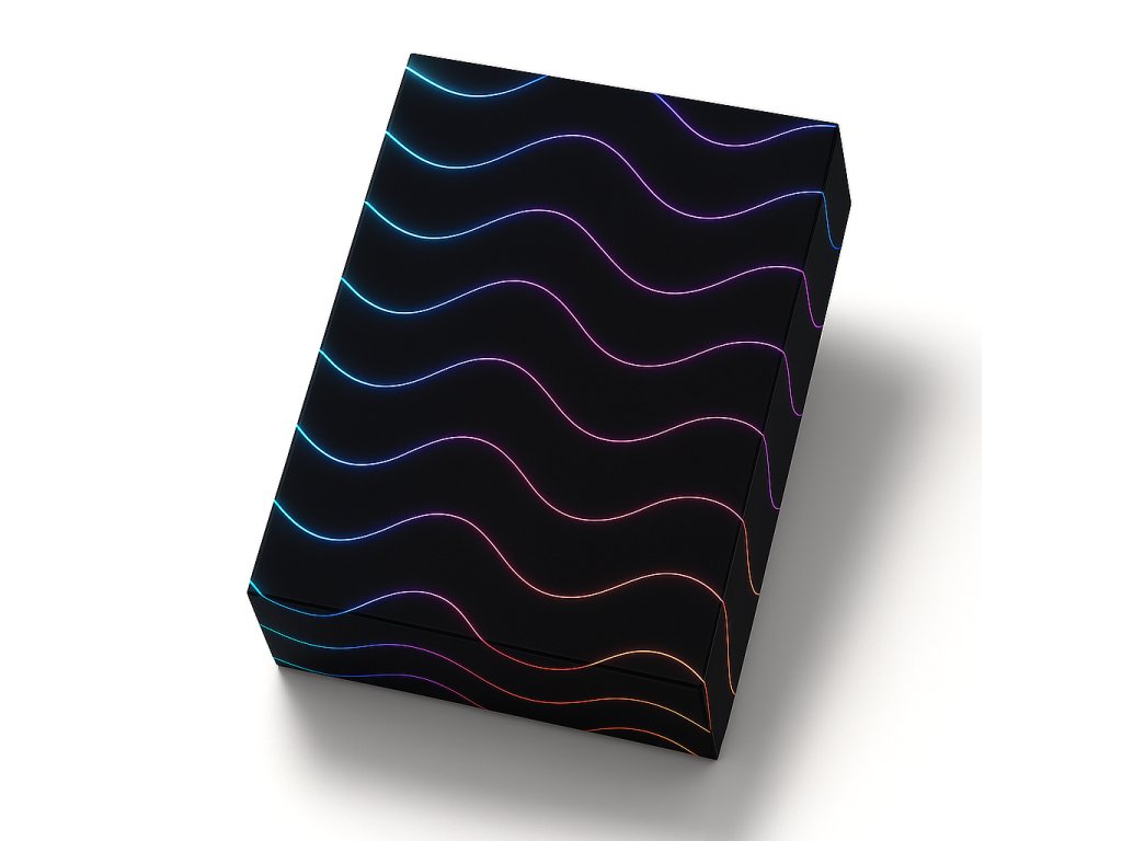 Design „Noční vlna“ je spojením minimalismu a kreativity. Černý podklad dodává krabičce luxusní vzhled, zatímco jemné vlny v zářivých neonových barvách vytvářejí dojem pohybu a energie. Perfektní volba pro moderní značky, které chtějí, aby jejich balení zaujalo na první pohled.