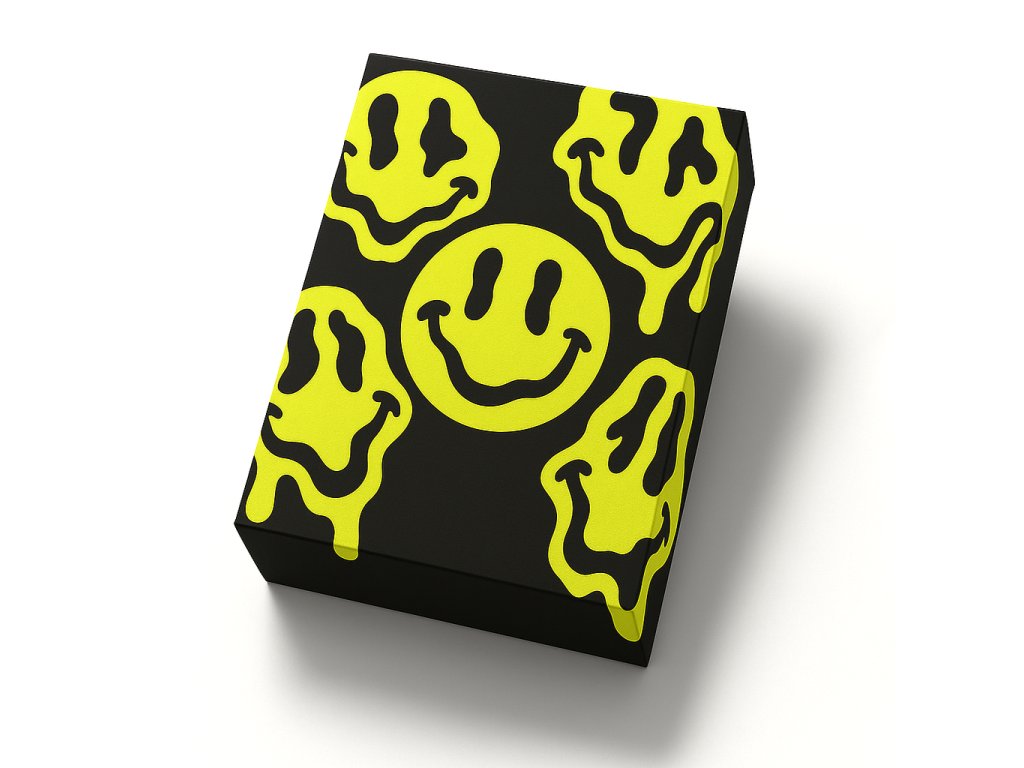 Krabička "Smile" vás okamžitě zaujme svým veselým a nekonvenčním designem. Na černém podkladu září neonově žluté smajlíky v kreativním provedení, které působí hravě a současně moderně. Perfektní volba pro dárky plné energie a dobré nálady – od módních doplňků po originální ručně vyráběné kousky.