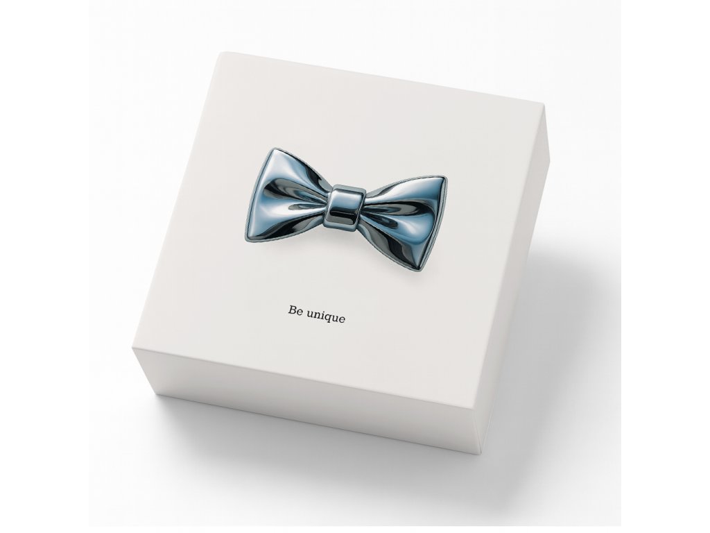 Tato luxusní designová krabička zaujme minimalistickým bílým provedením a moderním 3D prvkem – metalickým motýlkem uprostřed víka. Pod ním je decentní nápis „Be unique“, který dává balení osobitý a inspirativní nádech.