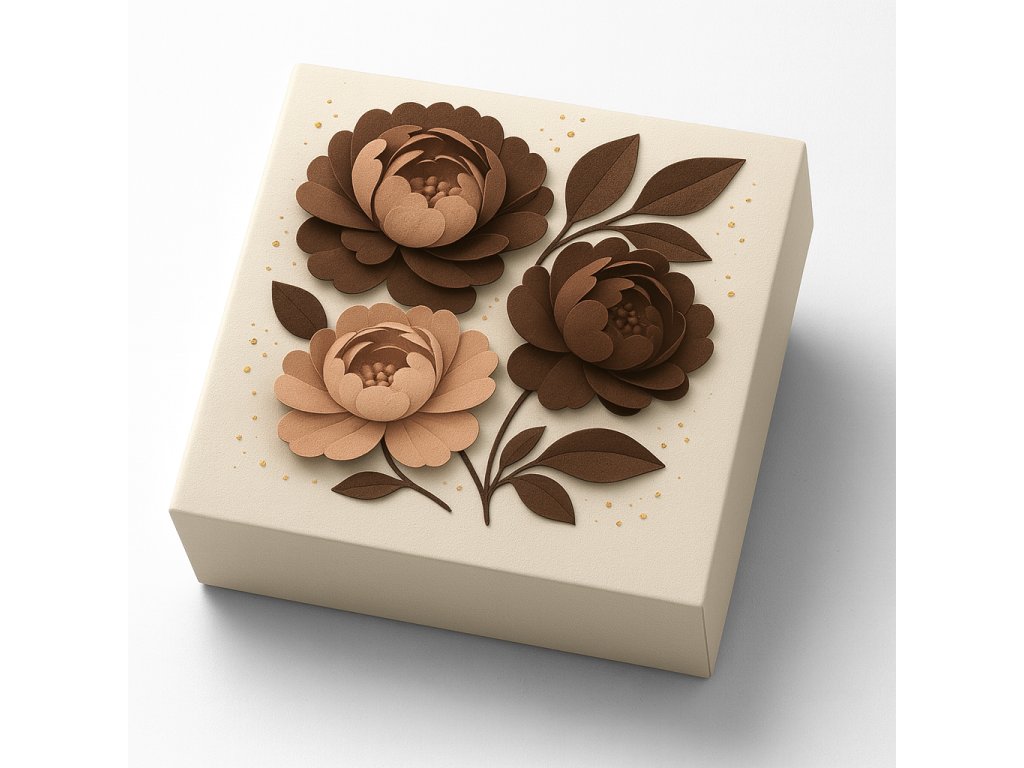 Tato luxusní designová krabička v jemně béžovém odstínu je zdobena 3D motivem hnědých květů, který působí sofistikovaně a přirozeně. Díky kombinaci neutrální barvy a detailního květinového vzoru je ideální pro balení elegantních dárků, ručně vyráběné kosmetiky, svatebních suvenýrů nebo malých překvapení.