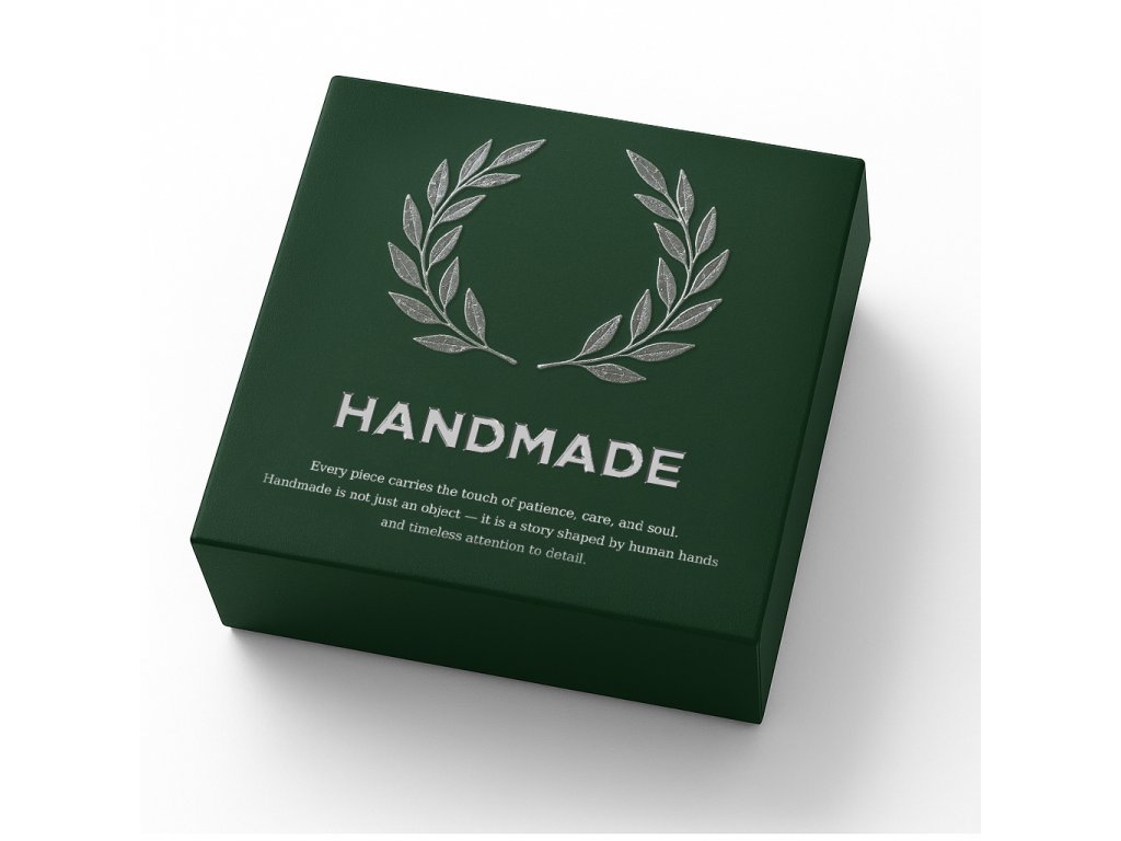 Tato designová krabička v tmavě zelené barvě je dokonalou volbou pro balení ručně vyráběných výrobků a dárků. Na víku je embosovaný vavřínový motiv a nápis „Handmade“, který podtrhuje osobní a jedinečný charakter obsahu.