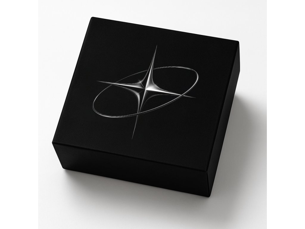 luxusní designová krabička v hluboké černé barvě, která okamžitě upoutá pozornost svým minimalistickým a sofistikovaným vzhledem. Na víku je decentní stříbrná hvězda se zářícím efektem, která symbolizuje eleganci a výjimečnost.