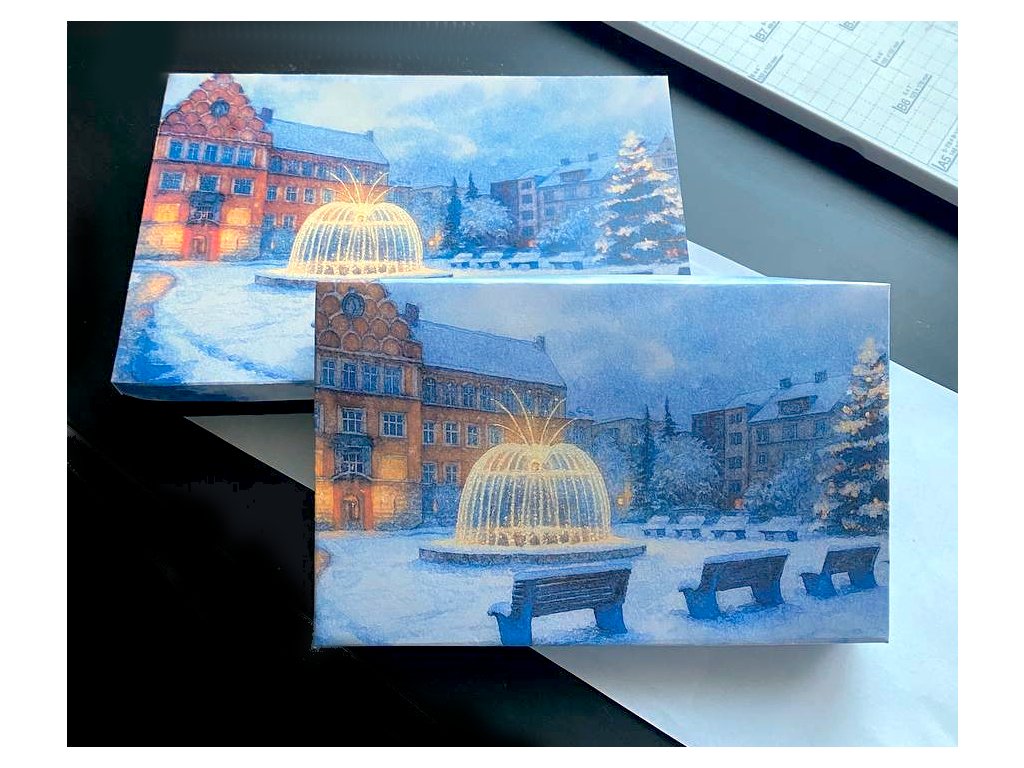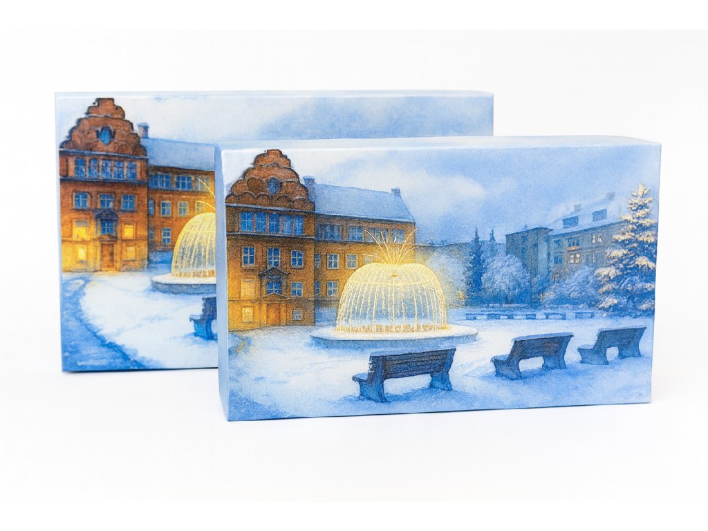 Objevte poetickou atmosféru Českého Těšína, zachycenou v podobě originální akvarelové ilustrace, která zdobí tuto dárkovou krabičku. Večerní město s osvětlenými lampami, tichým náměstím a historickými budovami vytváří hřejivou zimní náladu – jako malý kousek umění, který můžete darovat.