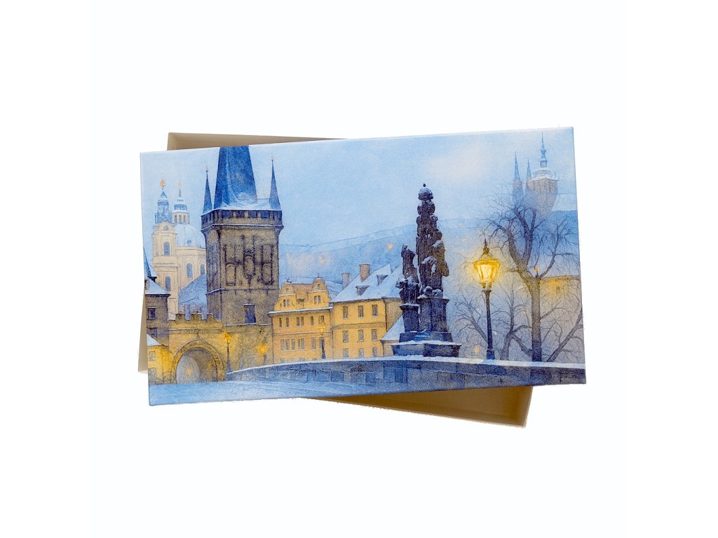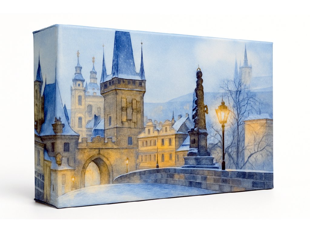 Objevte kouzlo zimní Prahy s touto elegantní dárkovou krabičkou zdobenou jemným akvarelovým motivem Karlova mostu. Ilustrace zachycuje romantickou atmosféru zasněženého Starého Města – teplá světla luceren, siluety věží a poklidný tón zimního večera vytvářejí jedinečnou náladu, která dává dárku skutečný styl a emoci.