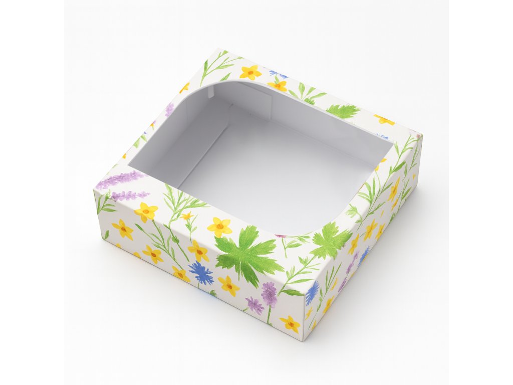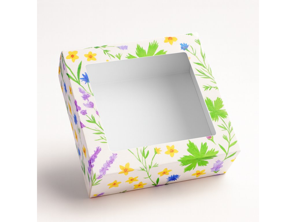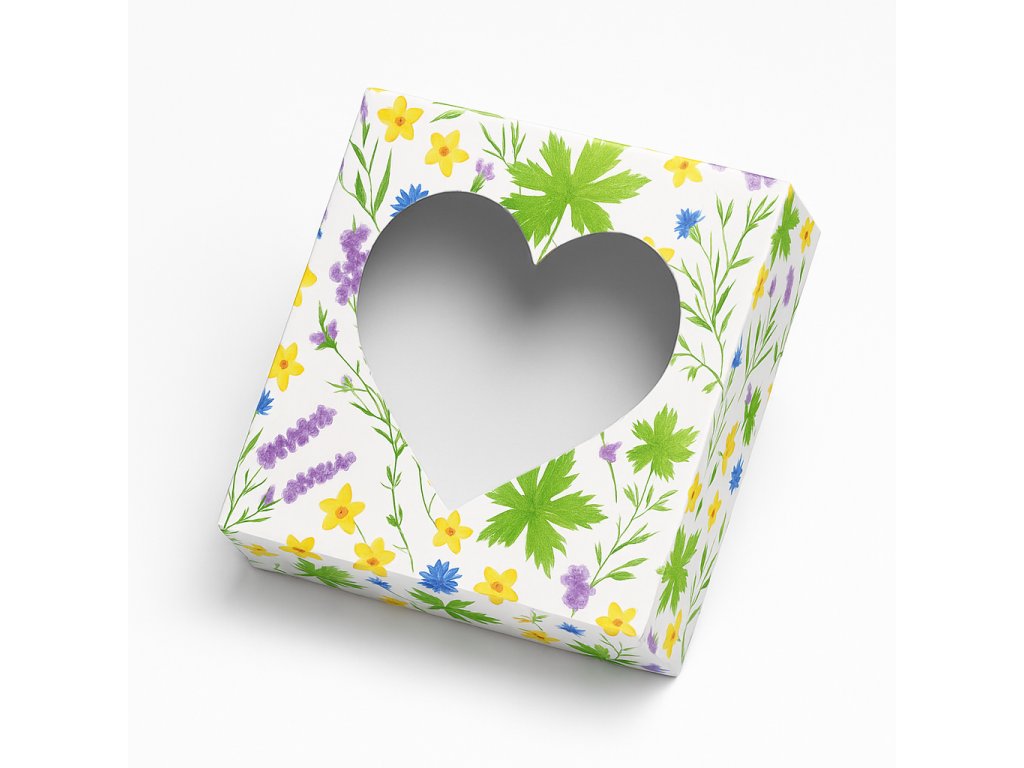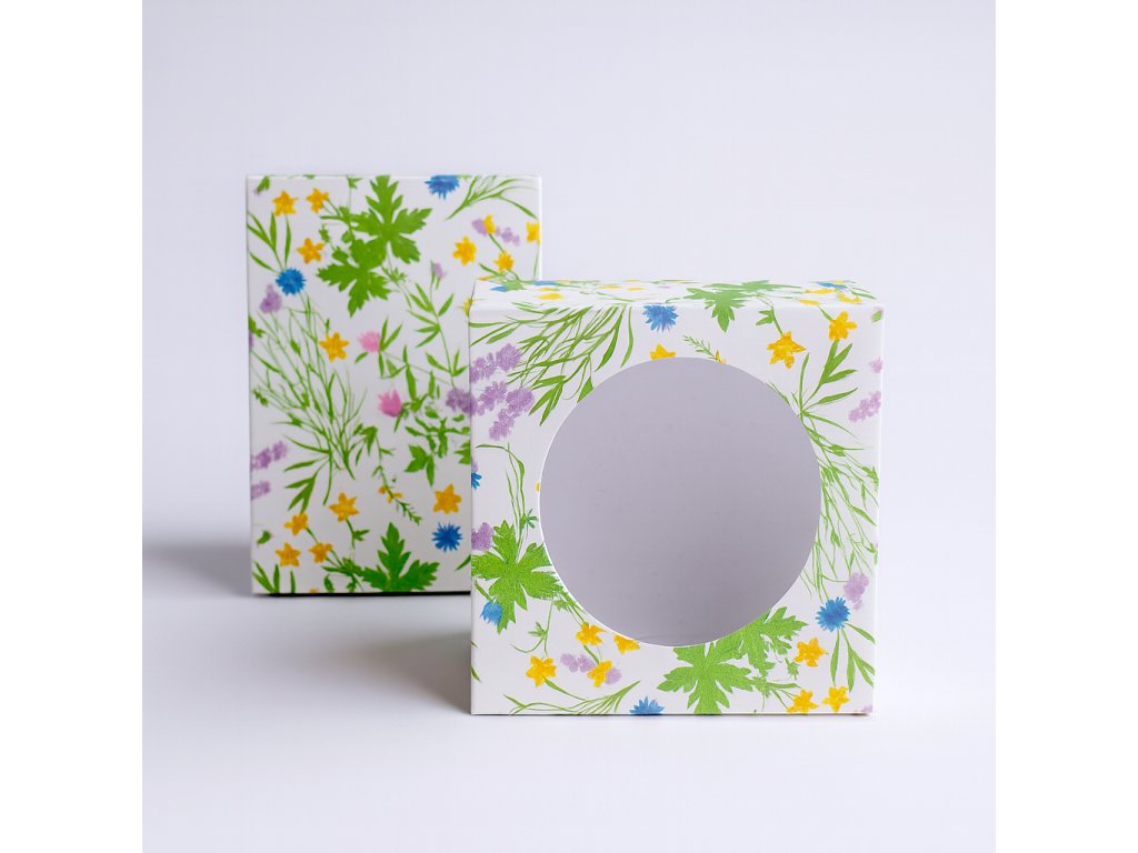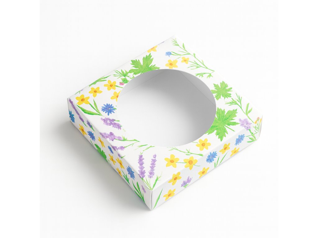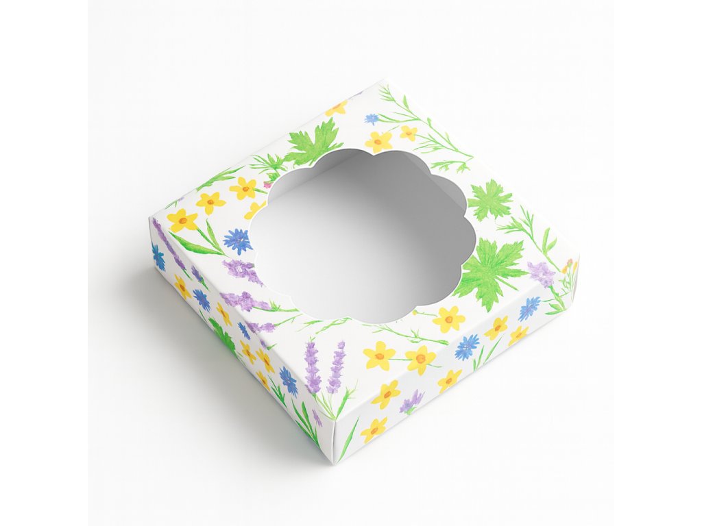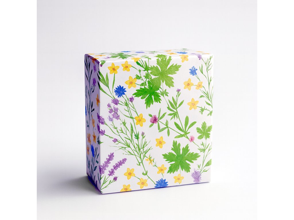 Dárková krabička „Summer Bloom“ vnese do vašeho balení kouzlo letní louky. Jemný design s motivy voňavé levandule, barevných chrp, žlutých kvítků a jetele působí přírodně a radostně. Perfektně se hodí pro balení ručně vyráběných mýdel, svíček, šperků nebo jiných drobných dárků. Nabízíme čtvercový i obdélníkový tvar a možnost výběru různých typů okének, aby vaše balení bylo ještě osobitější.