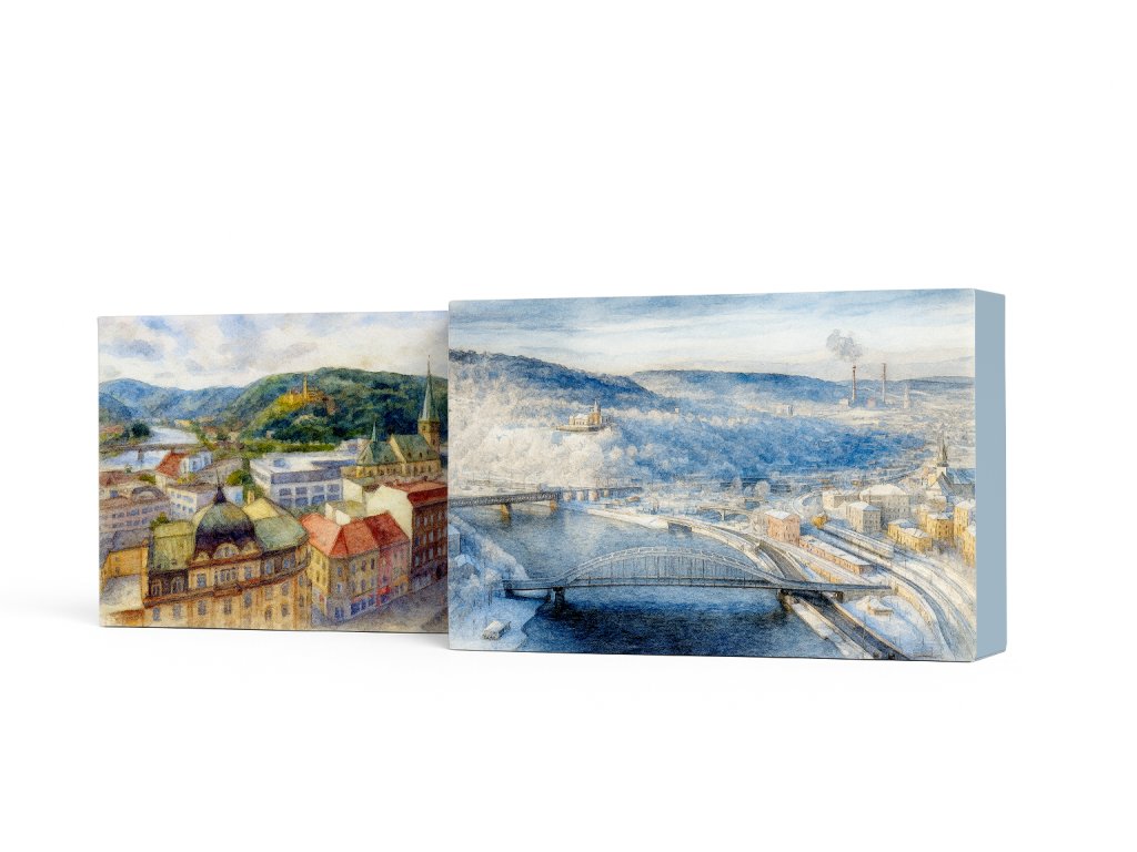 Objevte jedinečné dárkové krabičky inspirované městem Ústí nad Labem, které zachycují jeho atmosféru ve dvou nádherných akvarelových motivech – sluneční letní panorama a jemně zasněžený zimní výhled.