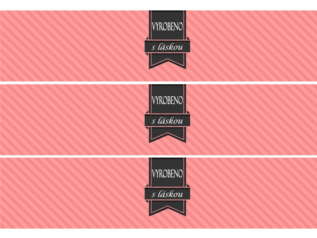 Text: nahoře nápis „VYROBENO“ bílým písmem verzálkami a uprostřed na vodorovném pruhu nápis „s láskou“ psaným kurzívou.