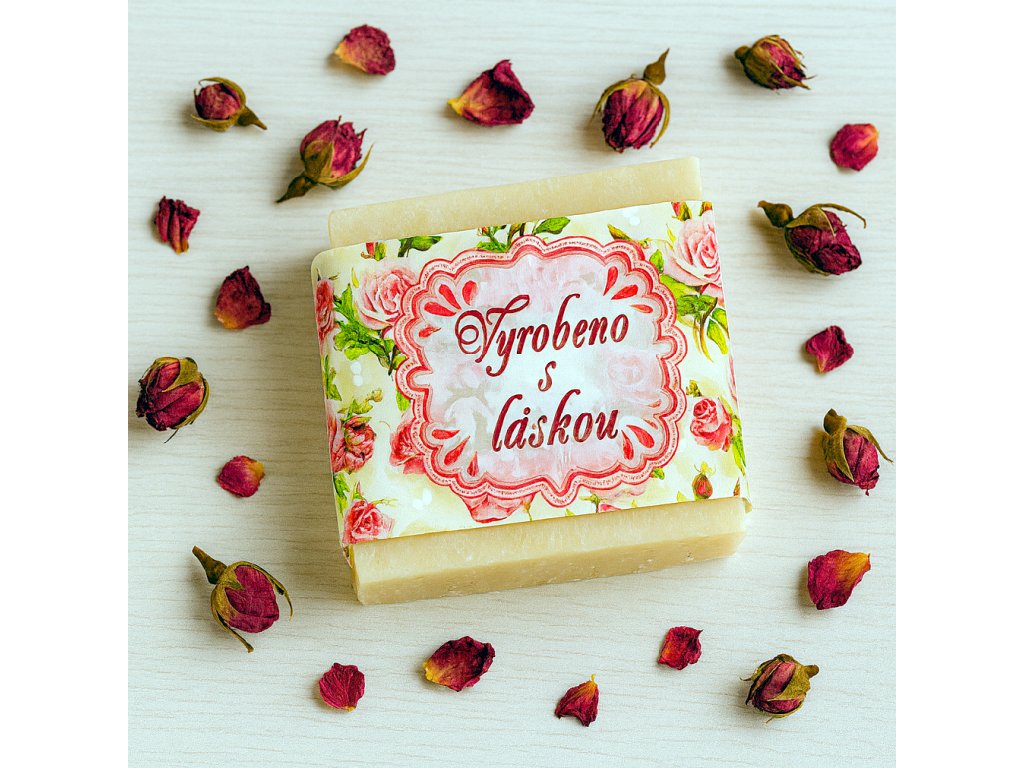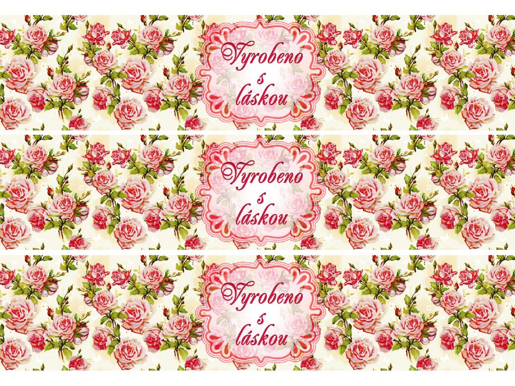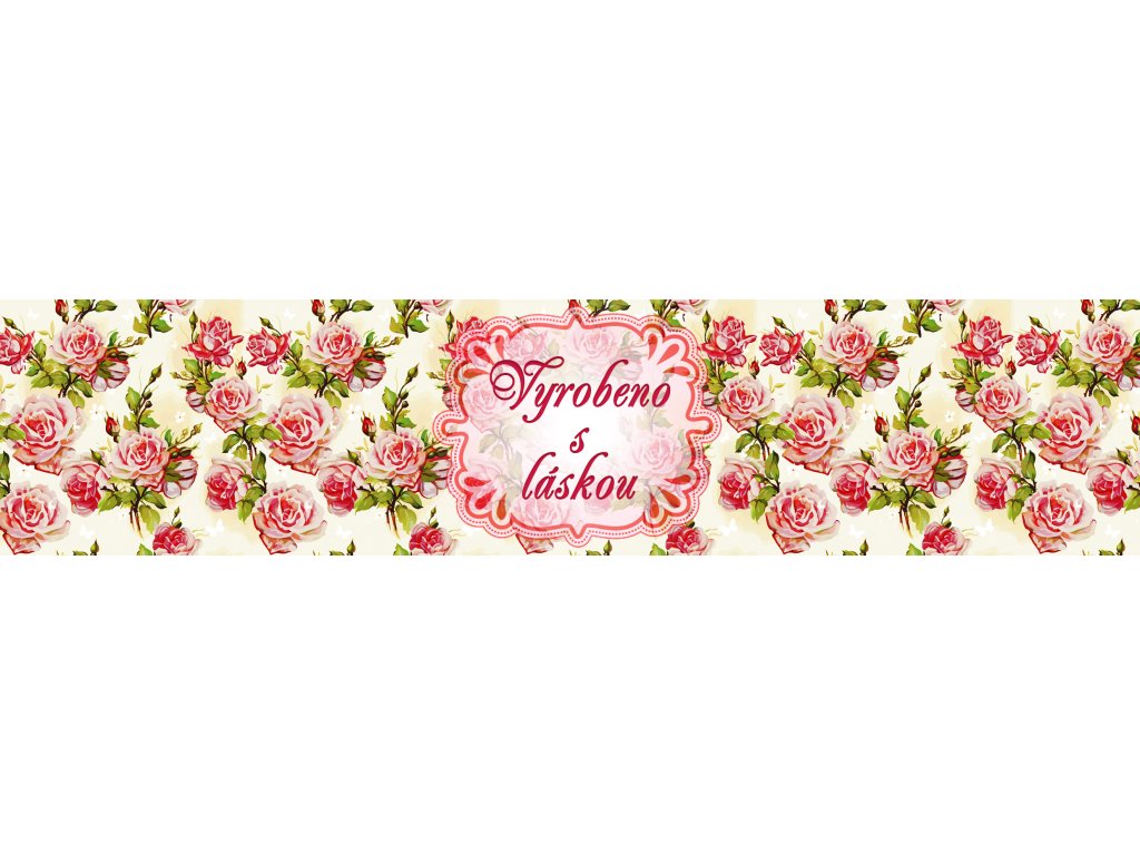 Středový prvek: uprostřed je zdobený rámeček s růžovo-červeným ornamentem, uvnitř kterého se nachází nápis „Vyrobeno s láskou“ psaný ozdobným kurzívním písmem.