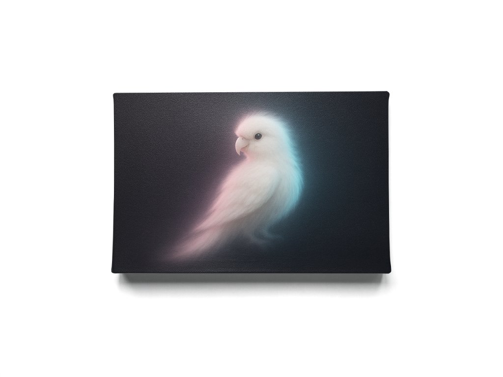Obraz Éterický Papoušek zobrazuje bílého papouška zahaleného do jemné, téměř snové záře. Minimalistické tmavé pozadí kontrastuje s lehkostí a čistotou ptáka, čímž vytváří klidnou a elegantní atmosféru.