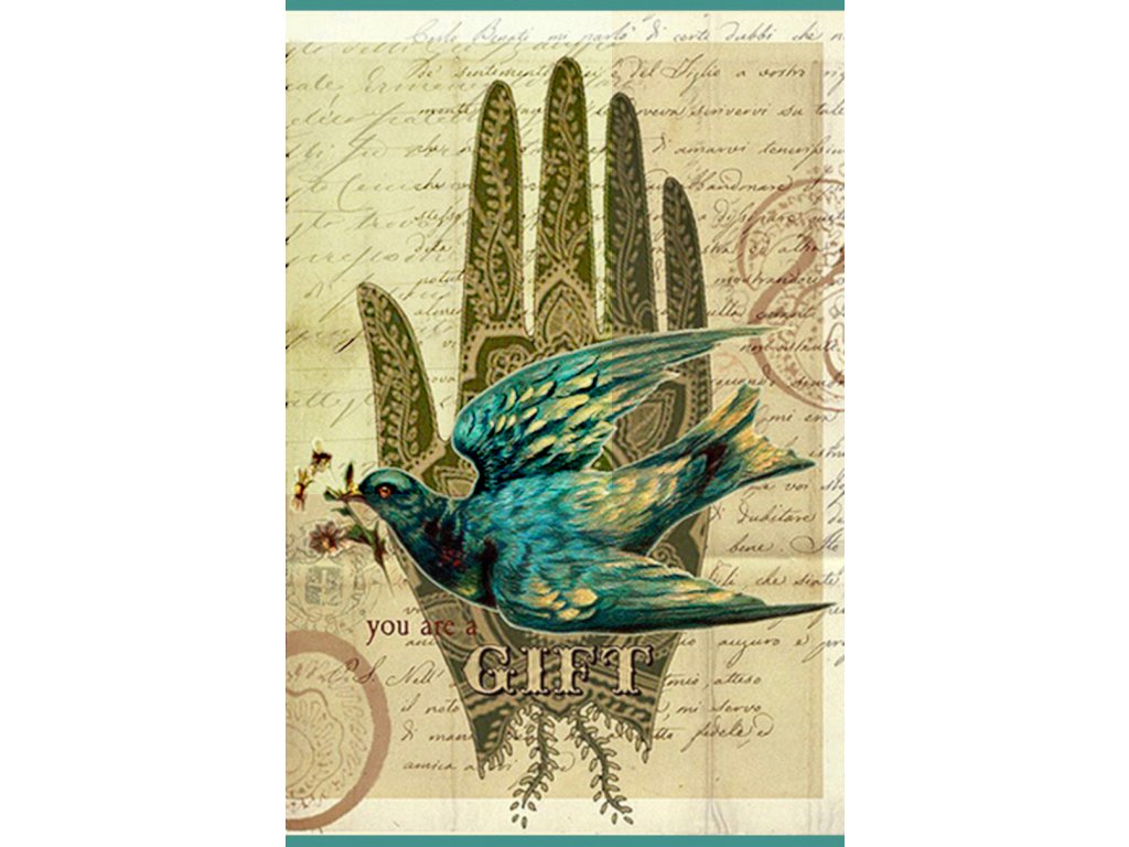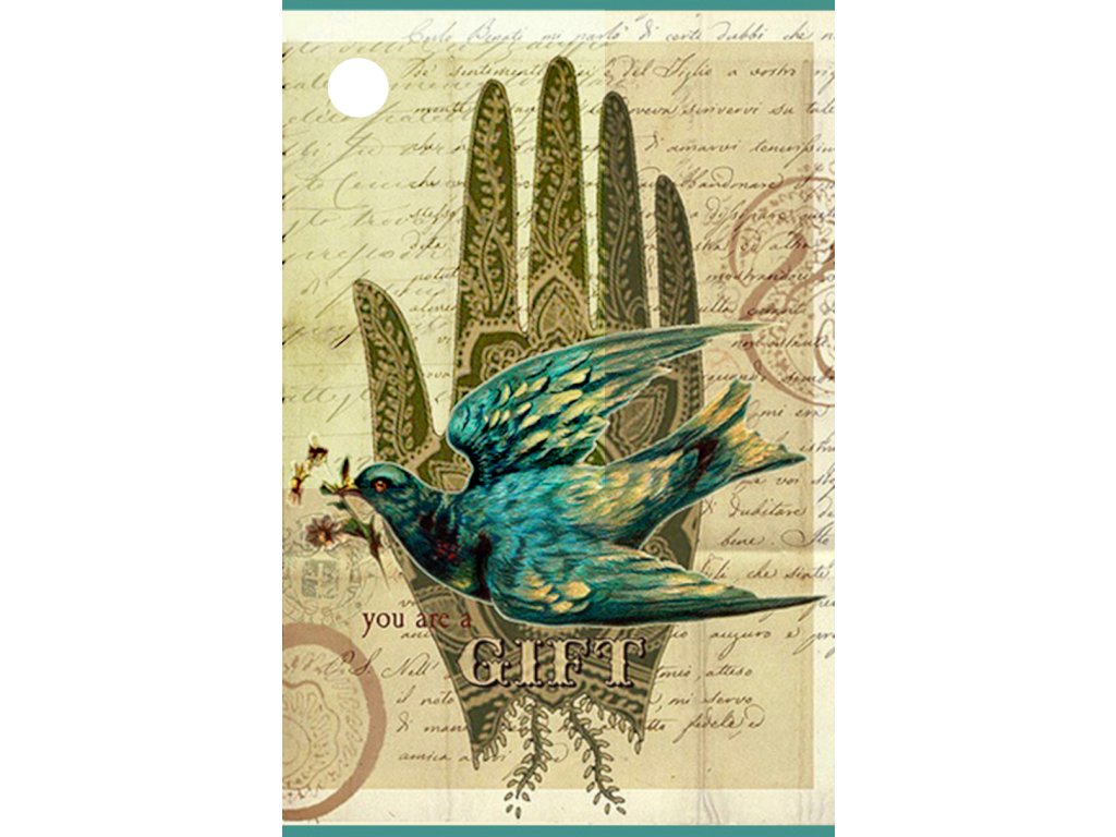 Originální visačka v uměleckém vintage stylu. Na pozadí s motivem starých dopisů a dekorativní kresby ruky letí modrý ptáček s kvítkem v zobáčku. Dole je napsáno „you are a GIFT“, což krásně vyjadřuje, že darovaný předmět je výjimečný.