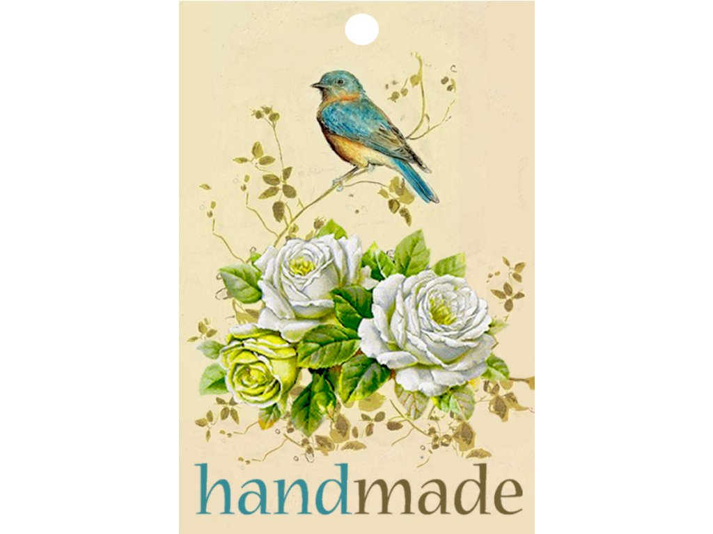 Elegantní obdélníková visačka v romantickém vintage stylu. Na krémovém podkladu je vyobrazen modrý ptáček sedící na větvičce a tři bílé růže se zelenými listy. Ve spodní části je nápis „handmade“ v jemném kombinovaném písmu.