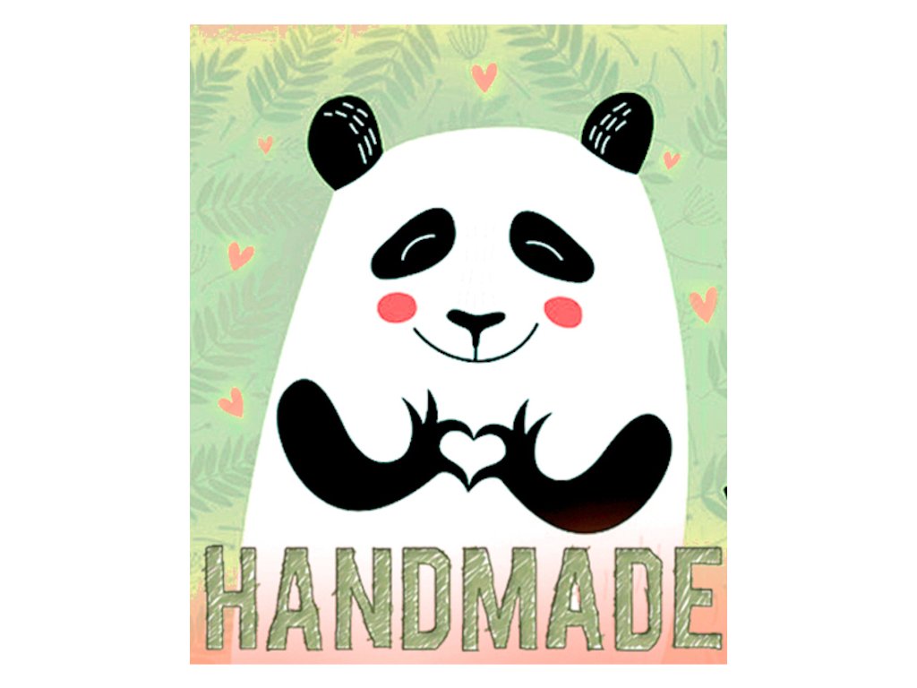 Roztomilá visačka s usměvavou pandou, která drží tlapky ve tvaru srdce. Na pozadí jsou jemné listy a malé růžové srdíčka. Ve spodní části je výrazný nápis „HANDMADE“ v rustikálním stylu.