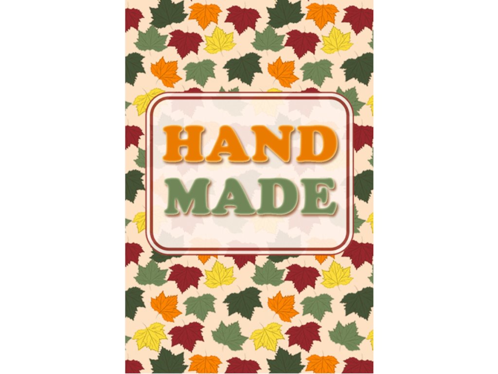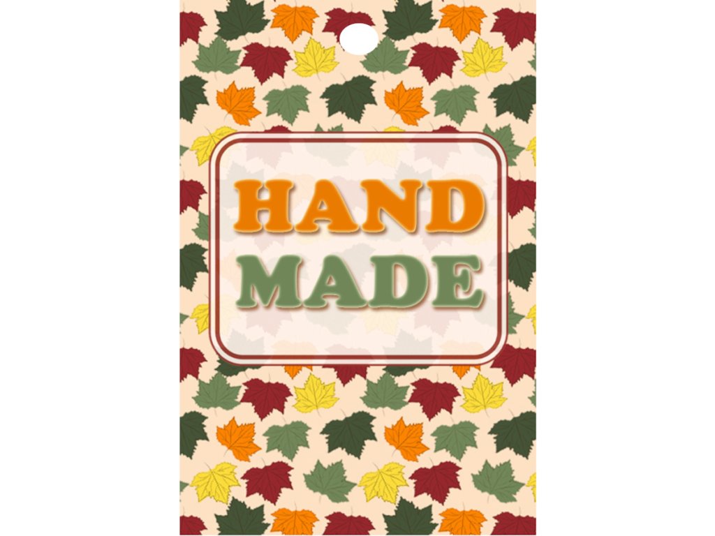 Stylová visačka v teplých podzimních barvách s motivem listů v odstínech oranžové, červené, žluté a zelené. Uprostřed je výrazný nápis „HANDMADE“ ve dvou barvách, který podtrhuje ruční práci a originalitu výrobku.
