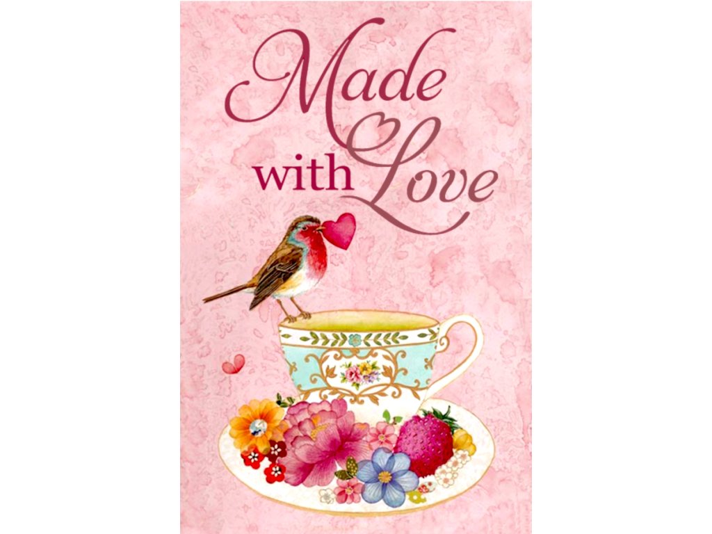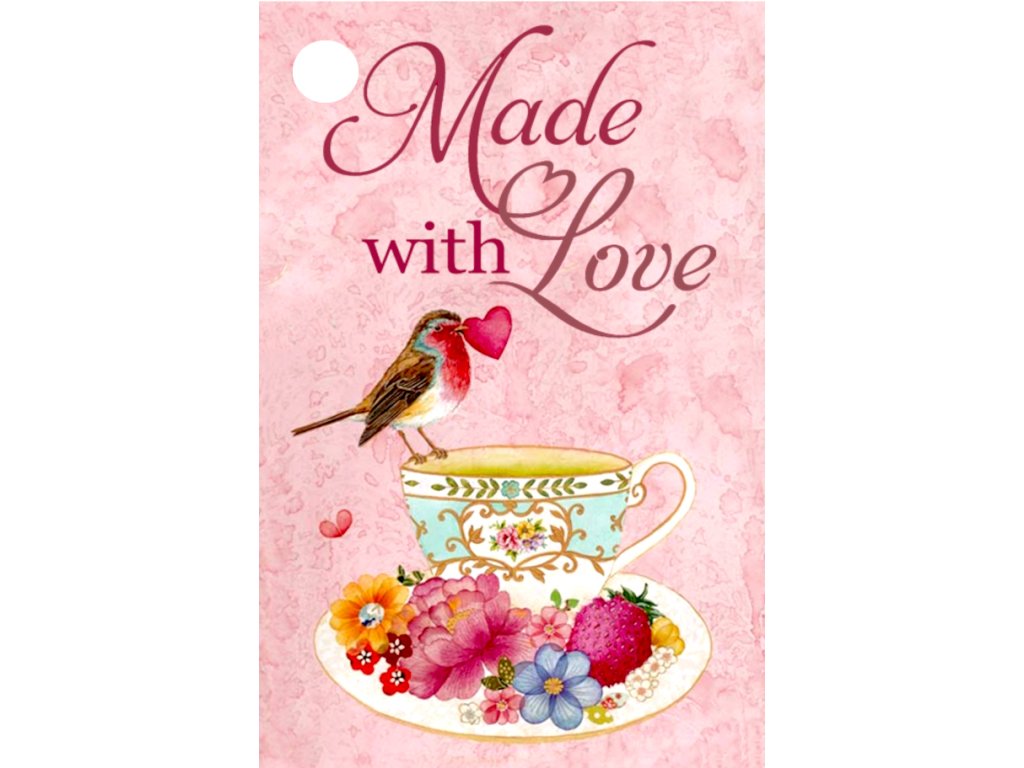 Romantická visačka s jemným růžovým pozadím a ilustrací čajového šálku plného barevných květin a jahody. Na šálku sedí ptáček s malým růžovým srdcem v zobáčku. Elegantní nápis „Made with Love“ zdůrazňuje, že dárek nebo výrobek byl vytvořen s péčí a láskou.