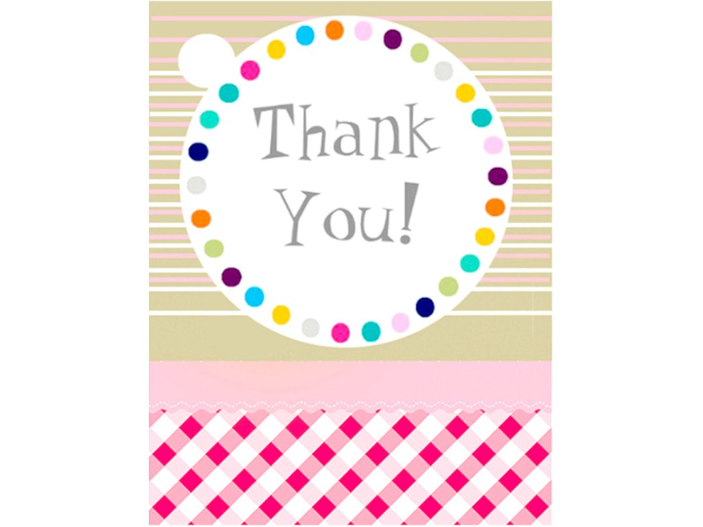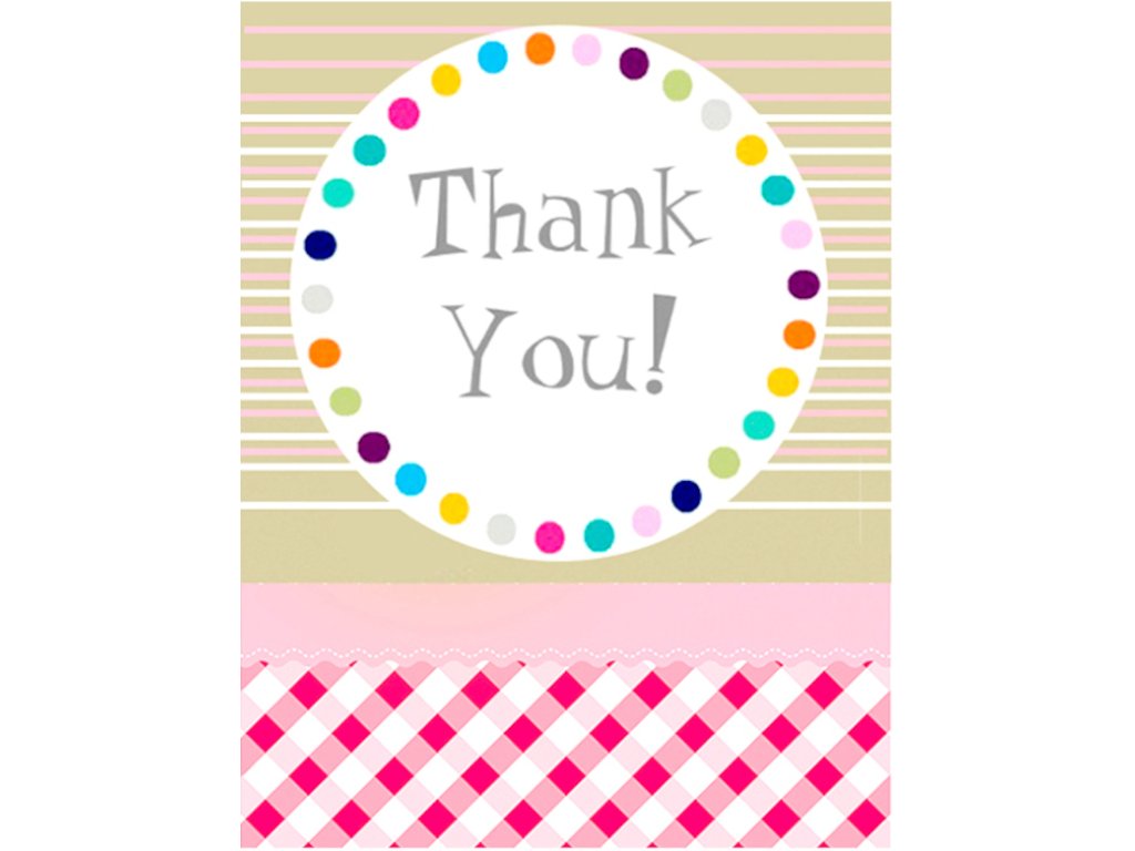 Veselá dárková visačka s nápisem „Thank You!“ uprostřed bílého kruhu, který je ozdoben barevnými puntíky. Horní část pozadí zdobí jemné pastelové proužky, spodní část růžovo-bílý kostkovaný vzor s dekorativním okrajem.
