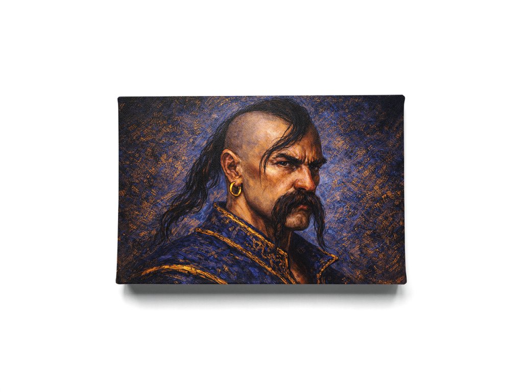 Tento umělecký obraz zachycuje kozáka jako zosobnění síly, nezávislosti a hrdosti. Výrazná tvář s tradičním účesem oseledets, mohutným knírem a zlatým kruhovým náušníkem odkazuje na bohatou historii kozáků jako obránců svobody a identity.