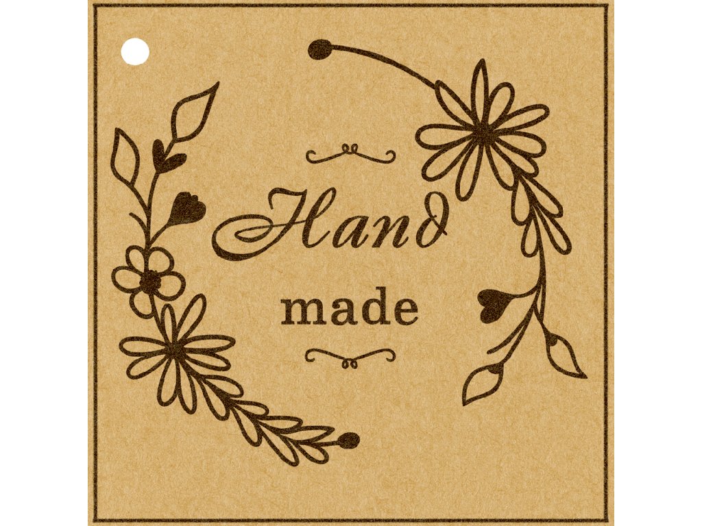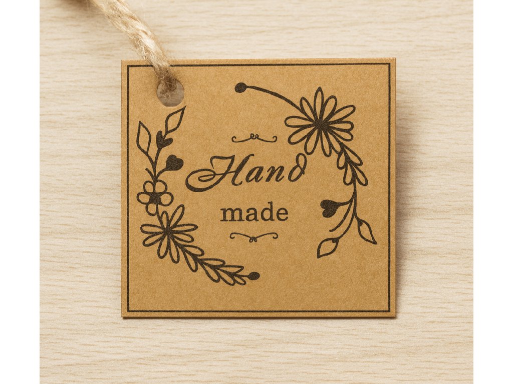 Čtvercová kartička-visačka z kraftového papíru s elegantním černým potiskem. Uprostřed je nápis „Hand made“ doplněný jemným ornamentem. Text je obklopen květinovým věncem z jednoduchých linek, který dodává kartičce přírodní a ručně vyráběný vzhled.
