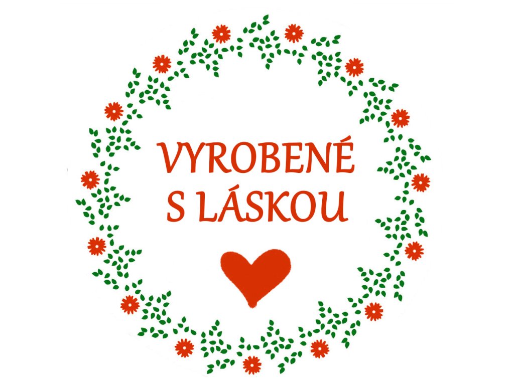 Kulatá samolepka s nápisem „Vyrobeno s láskou“ v červené barvě, doplněná o srdíčko a věnec z červených kvítků a zelených lístků po obvodu. Skvěle se hodí pro dekoraci ručně vyráběných produktů – domácích dobrot, svíček, mýdel, kosmetiky či dárkových balíčků. Dodá balení osobní a láskyplný vzhled.
