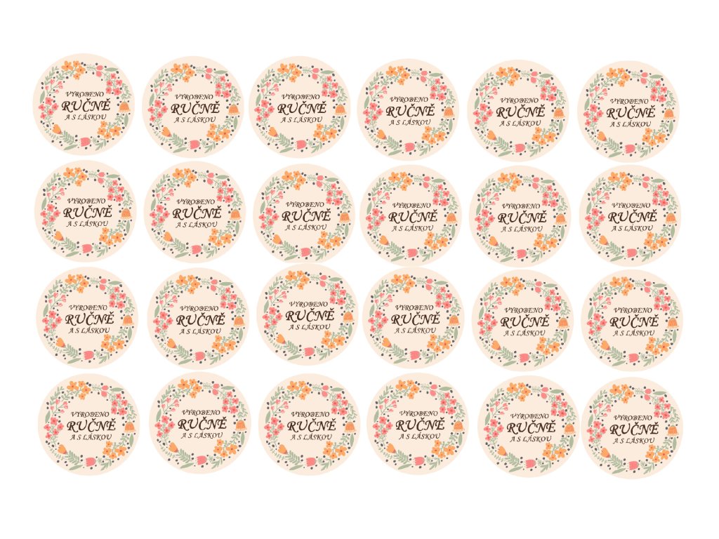 Samolepka „Vyrobeno ručně a s láskou“ – kulatá s květinovým věncem
