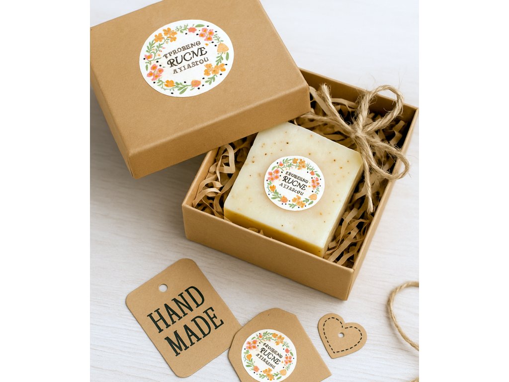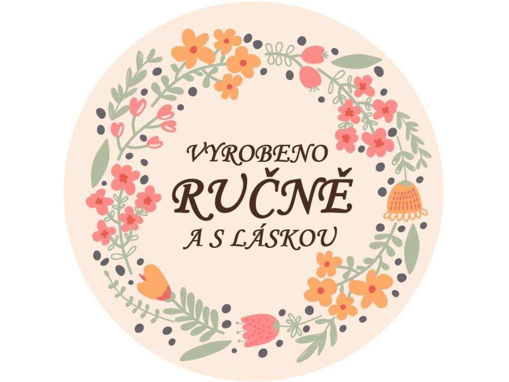 Kulatá samolepka s nápisem „Vyrobeno ručně a s láskou“. Design zdobí barevný květinový věnec s jemnými detaily v oranžových, růžových a zelených tónech. Ideální pro označení a dekoraci handmade produktů – mýdel, svíček, kosmetiky, domácích dobrot nebo dárkových balíčků. Dodá vašim výrobkům přirozený a originální vzhled.